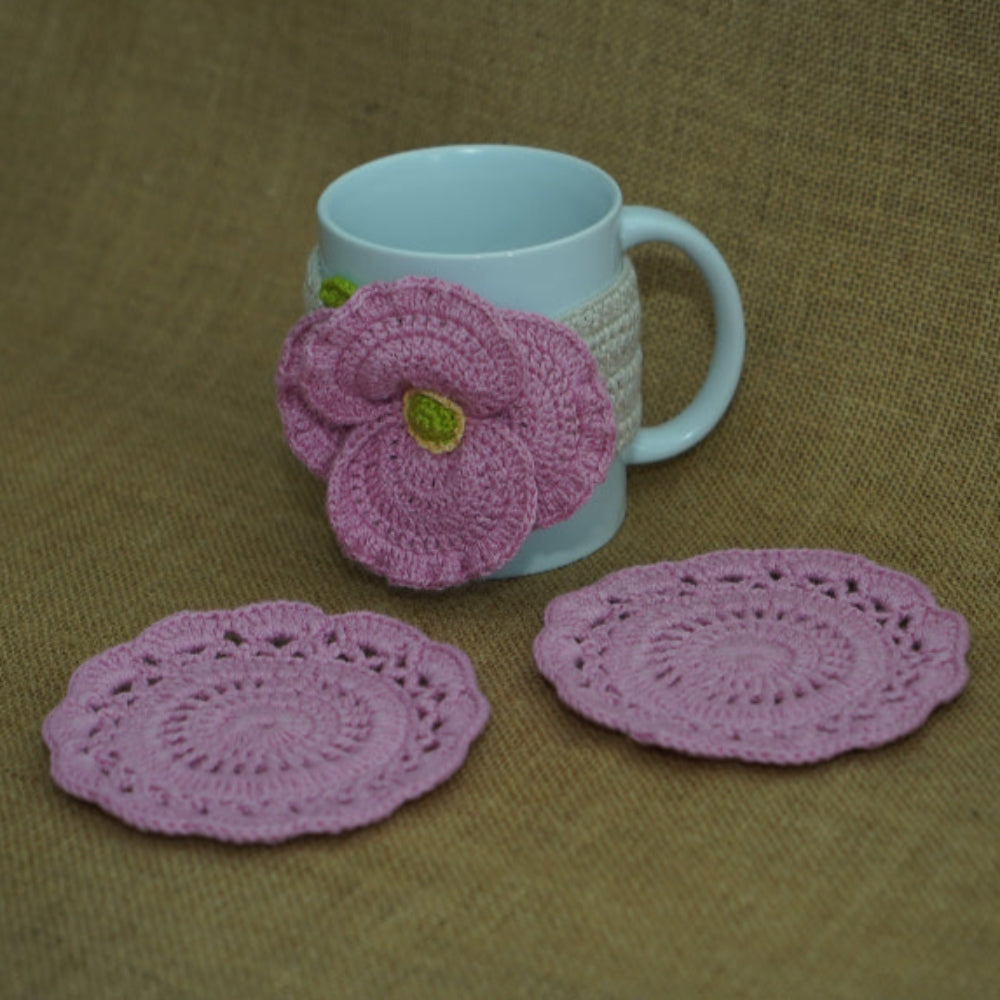 Keywords: Crochet poppy mug warmer, handmade coffee sleeve, winter tea mug cozy, cotton crochet cup warmer, eco-friendly drink sleeve, reusable flower mug cover